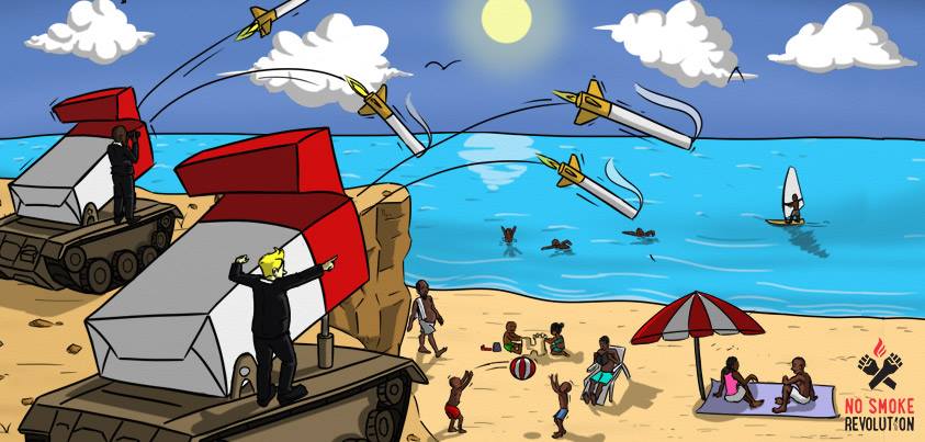 Cartoon of cigarette packs shooting off cigarette rockets towards the water from the beach.